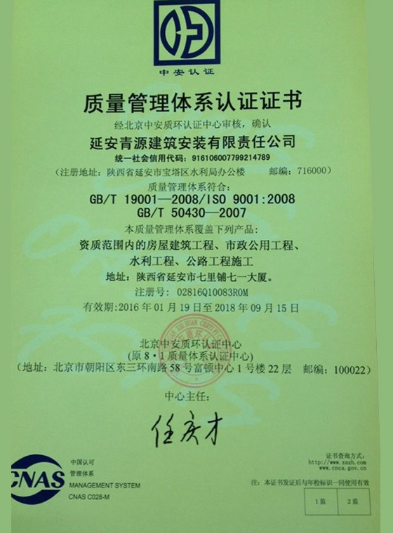 延安青源建筑安装有限责任公司质量管理体系认证证书