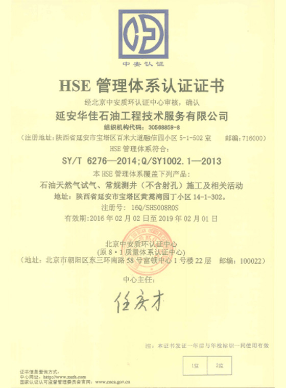 延安华佳石油工程技术服务有限公司HSE管理体系认证证书