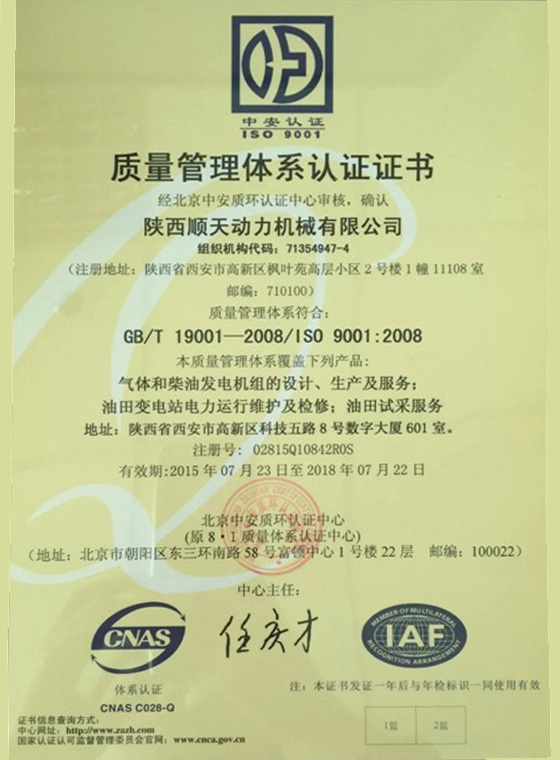 陕西顺天动力机械有限公司质量管理体系认证证书